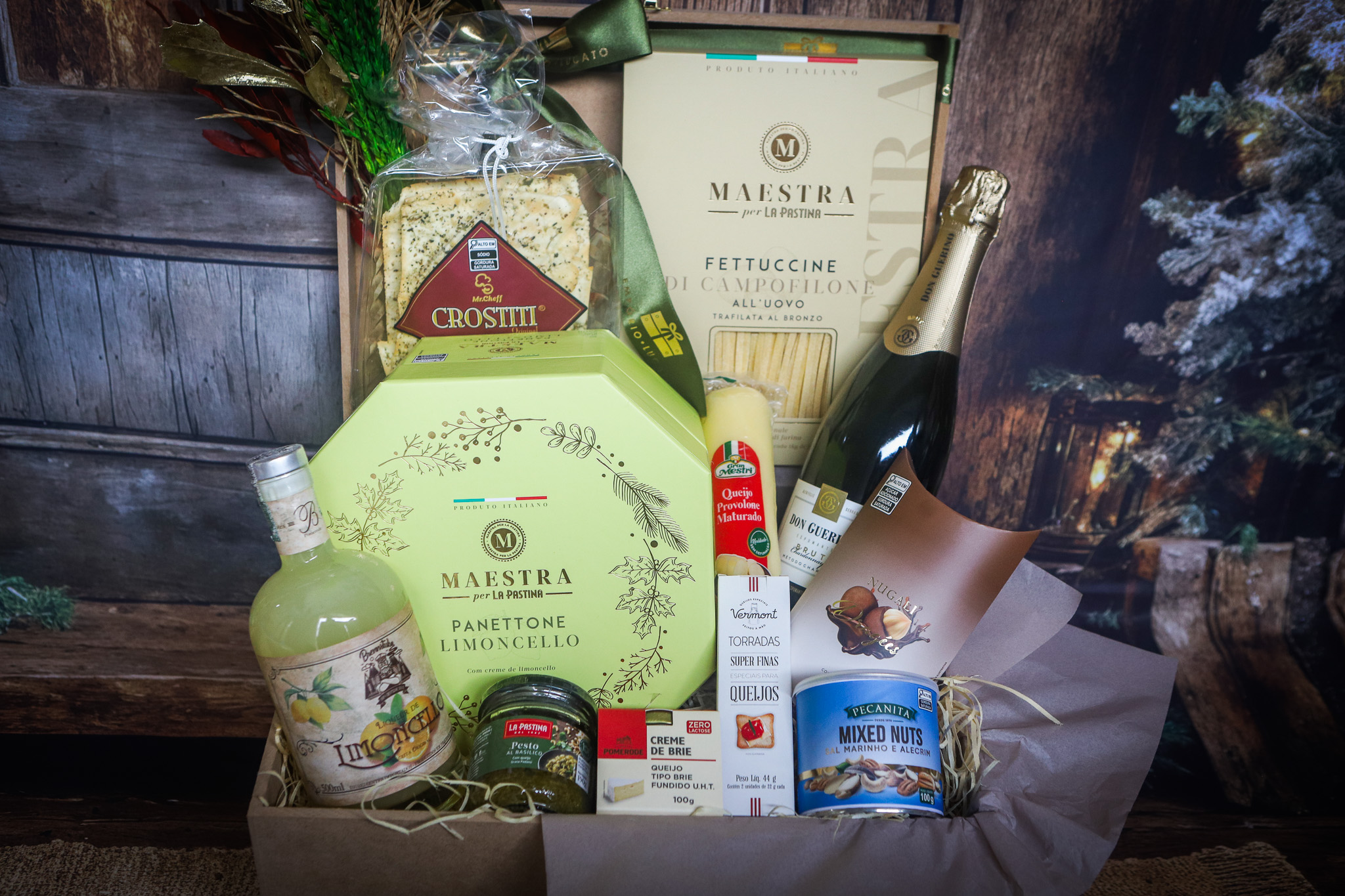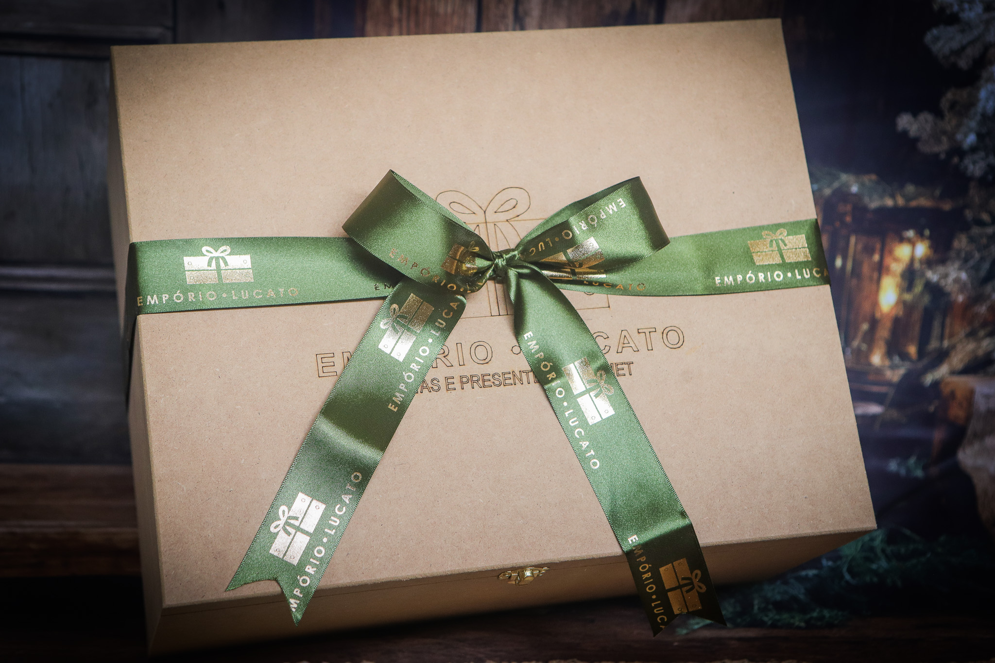 Cesta de Natal Verona com 12 itens, nacionais, importados e artesanais de qualidade. Um presente exclusivo repleto de sabores especiais para celebrar o Natal com bom gosto e tradição. Acondicionada no baú de madeira MDF com laço em cetim.