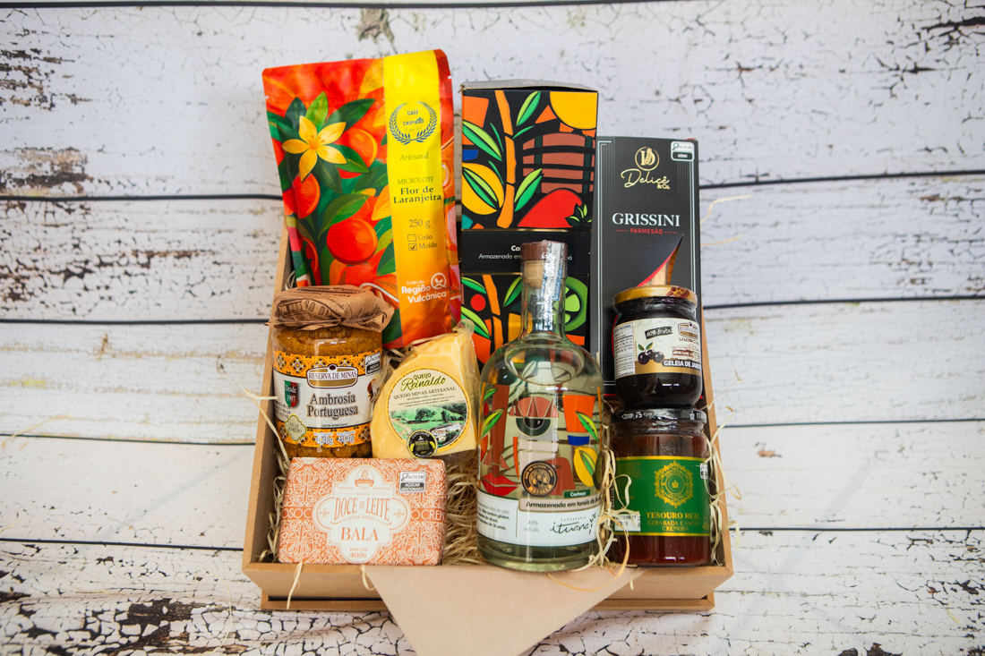 Esta Cesta reúne as grandes Especialidades de Minas Gerais como Doces, Queijo da Canastra e um excelente Café Microlote especial pontuado, além da Cachaça Ituana, premiada em 2023 – Medalha de Ouro no 23º Concurso de Vinhos e Destilados do Brasil, esta cachaça é armazenada em dornas de jequitibá por seis meses e apresenta graduação alcoólica de 40%.